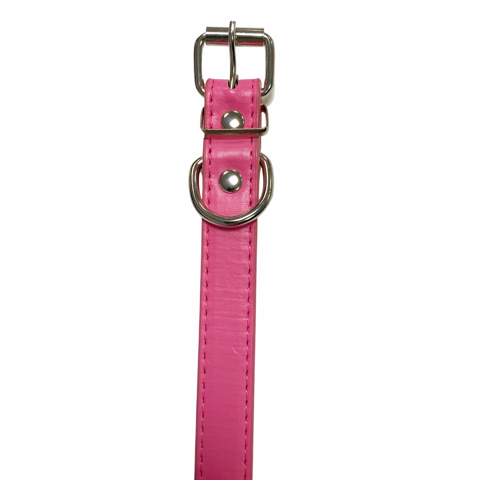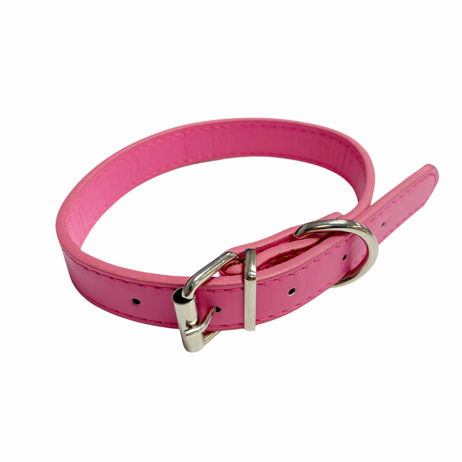 This adjustable PU Collar in a solid colour on both sides. Made from PU with a simple watch-style buckle for fastening and 5 holes for different sizes.