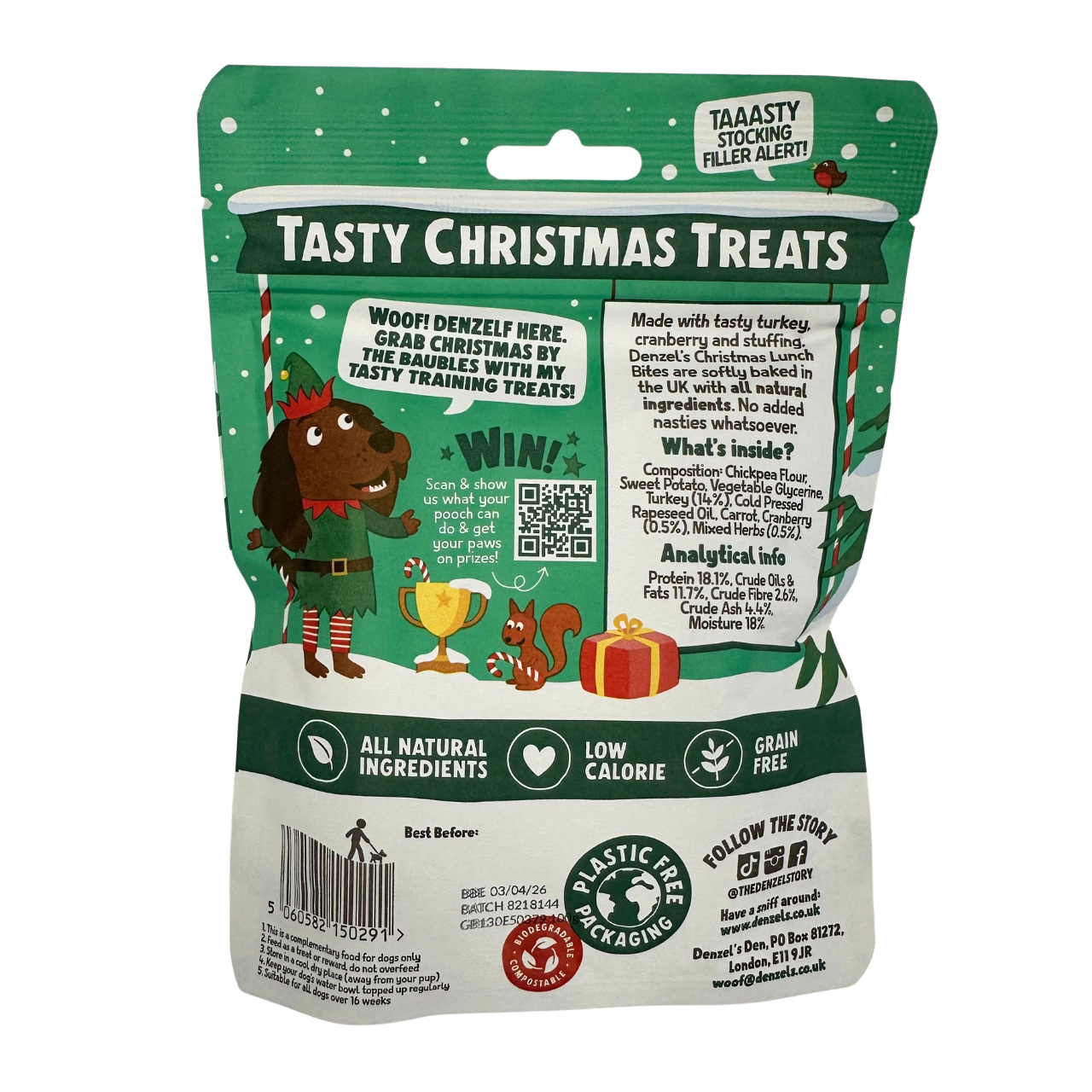 Christmas Lunch Bites 100g: Chickpea Flour, Sweet Potato, Vegetable Glycerine, Turkey 14%, Cold Pressed Rapeseed Oil, Carrot, Cranberry 0.5%, Mixed Herbs 0.5%
