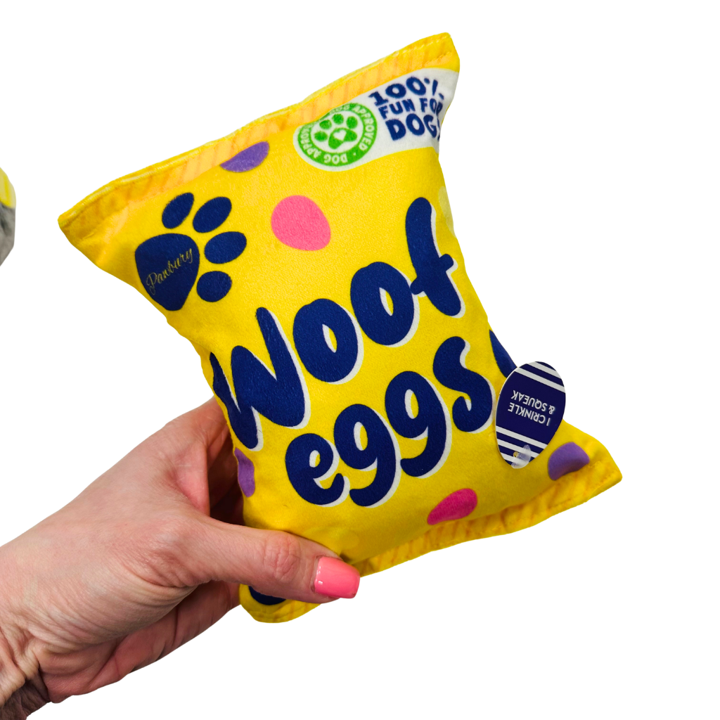 The Woof Eggs toy measures L17 x W15cm, is made from cotton and polyester, and features a crinkly fabric and squeaker within to keep dogs excited. 'Woof Eggs' printed on the front with bright colours.