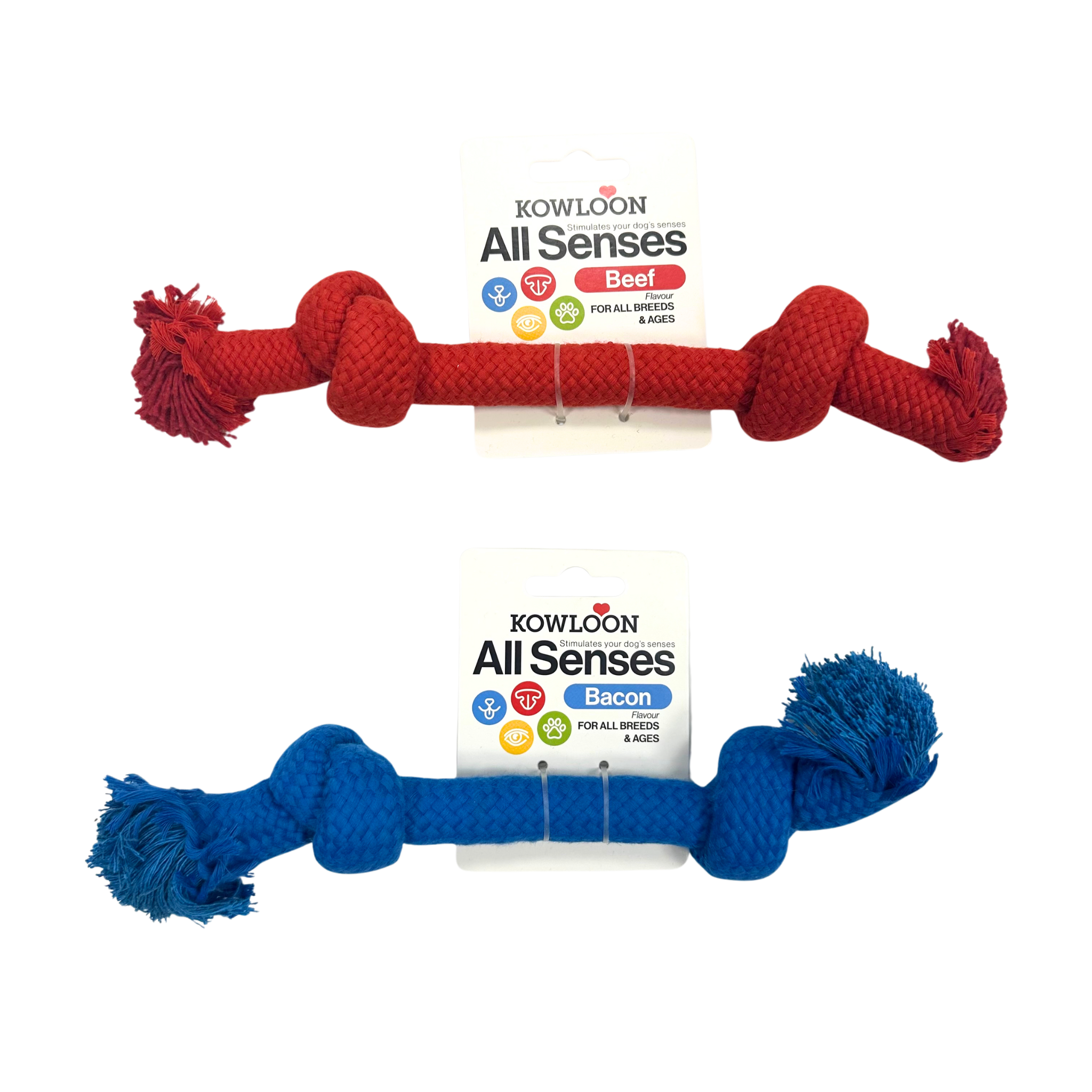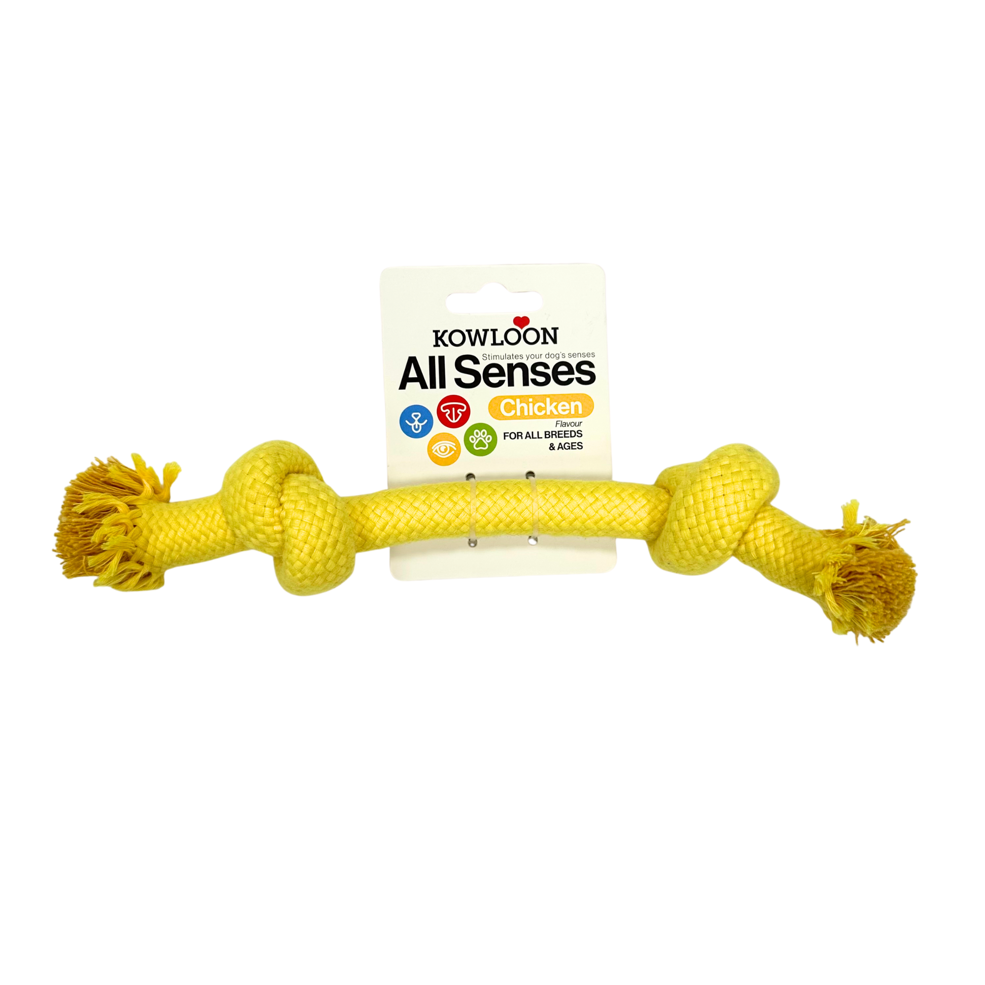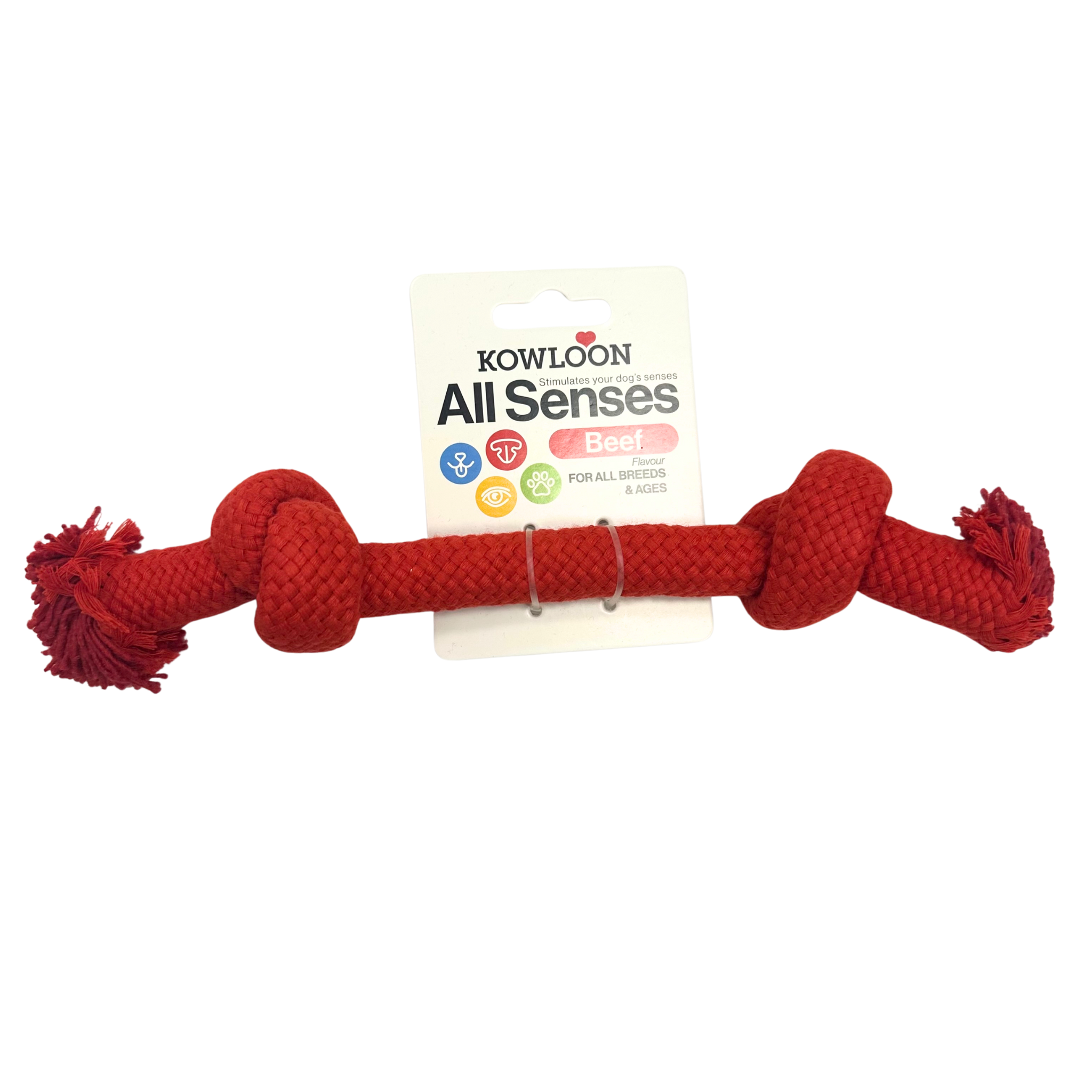 The Kowloon All Senses Rope Dog Toy is a heavy-duty rope knot toy with meaty scents designed for small dogs. Made from durable rope material in a vibrant red, yellow or blue colour, this toy provides an engaging and stimulating play experience for your furry companion. The smell is not too intense but strong enough to waken your dog's senses!