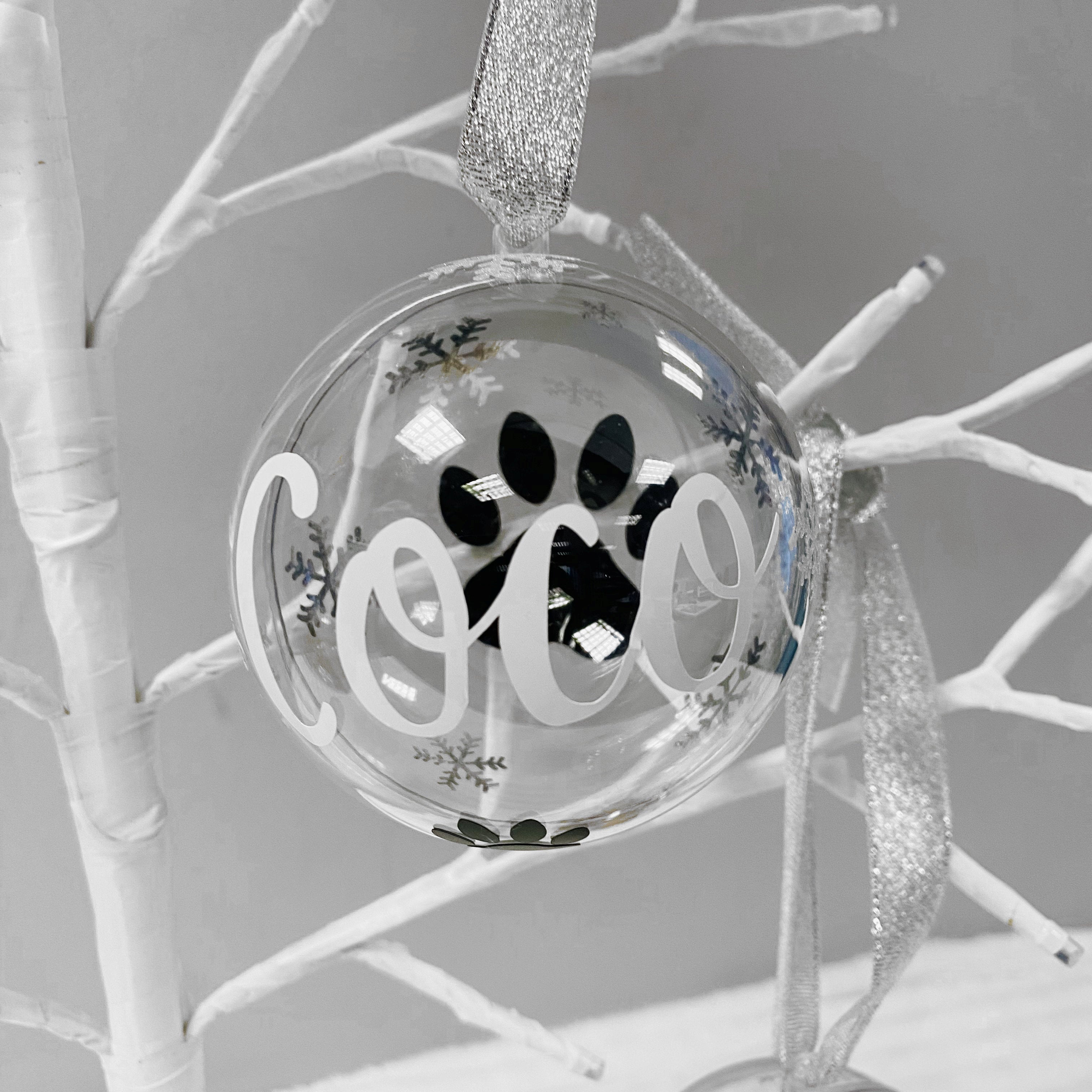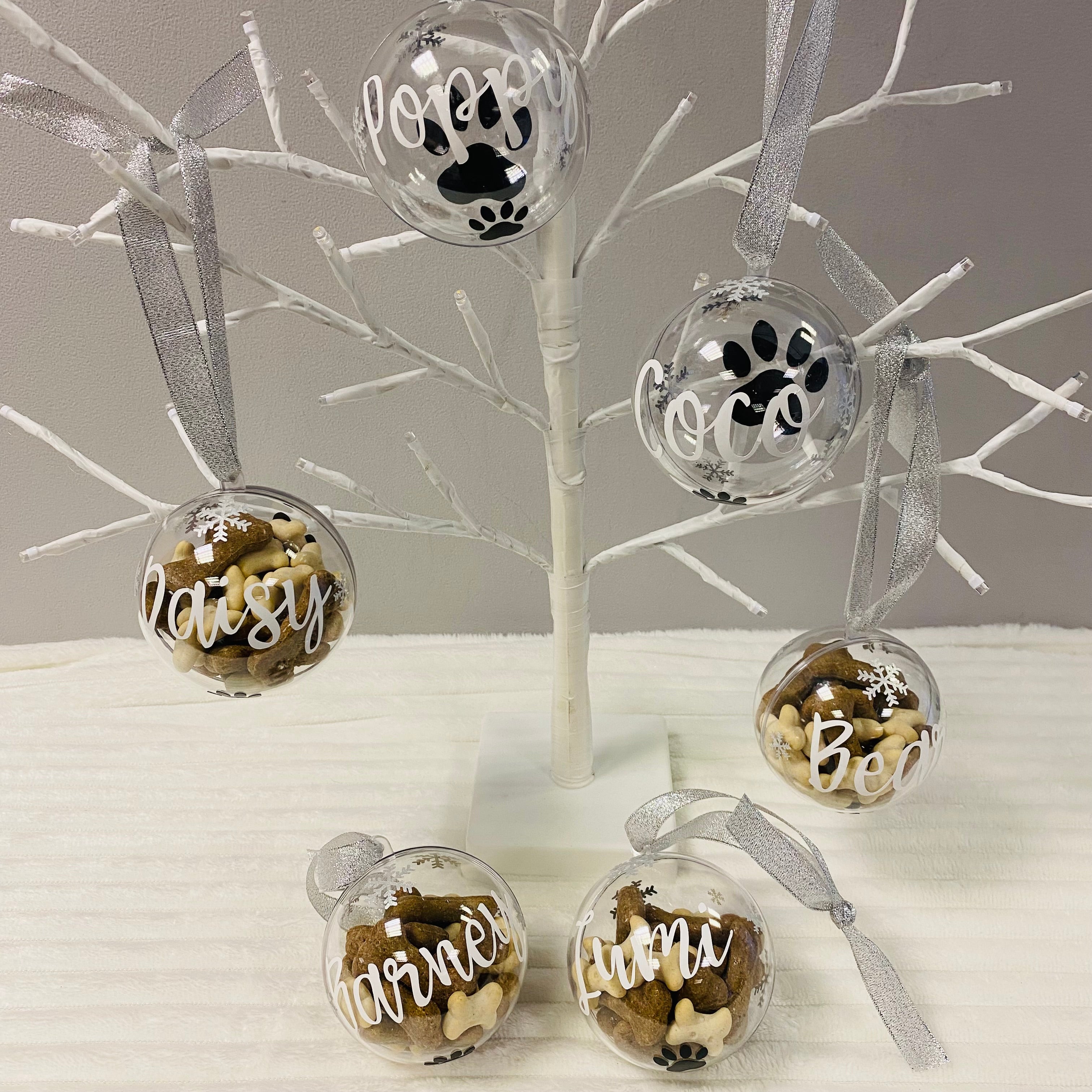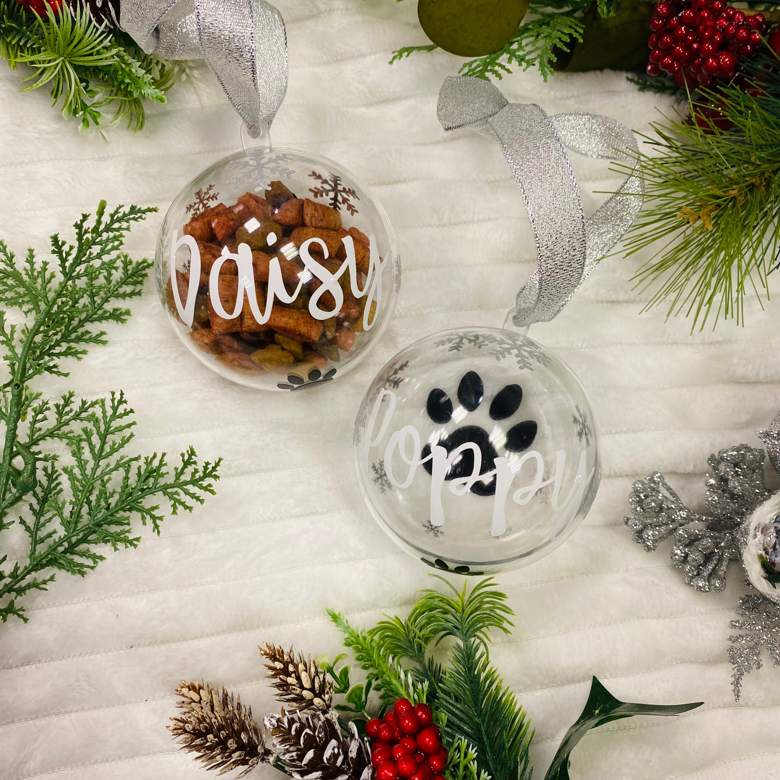 Our Personalised Christmas Baubles are the perfect Christmas decoration or gift for a loved one! We will personalise your dog or cat's name onto a fillable bauble - choose whether you want the bauble to be filled with treats, or left empty, add your name and we'll do the rest! The name is printed on white on the front with snowflakes and pawprints on both the front and back.