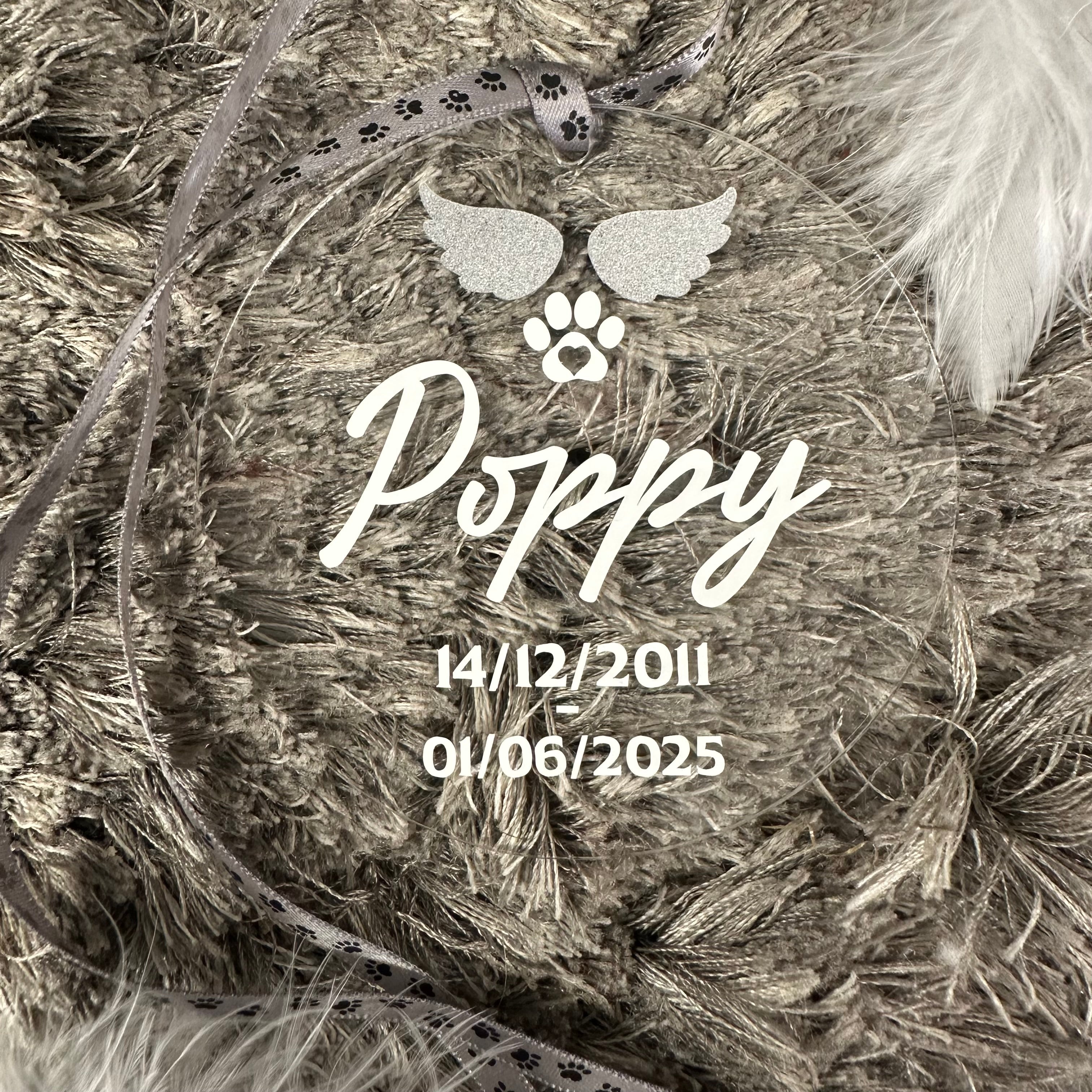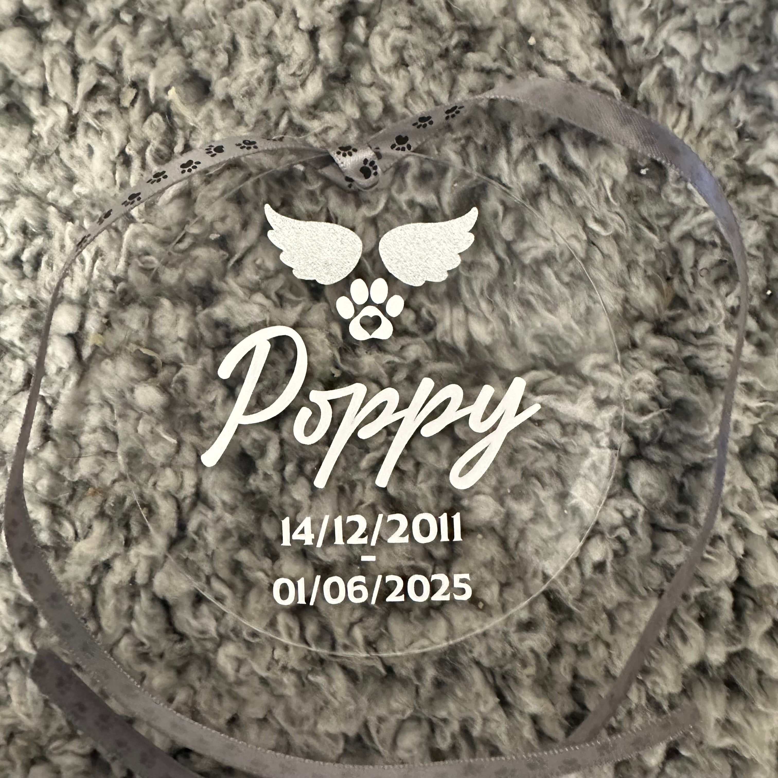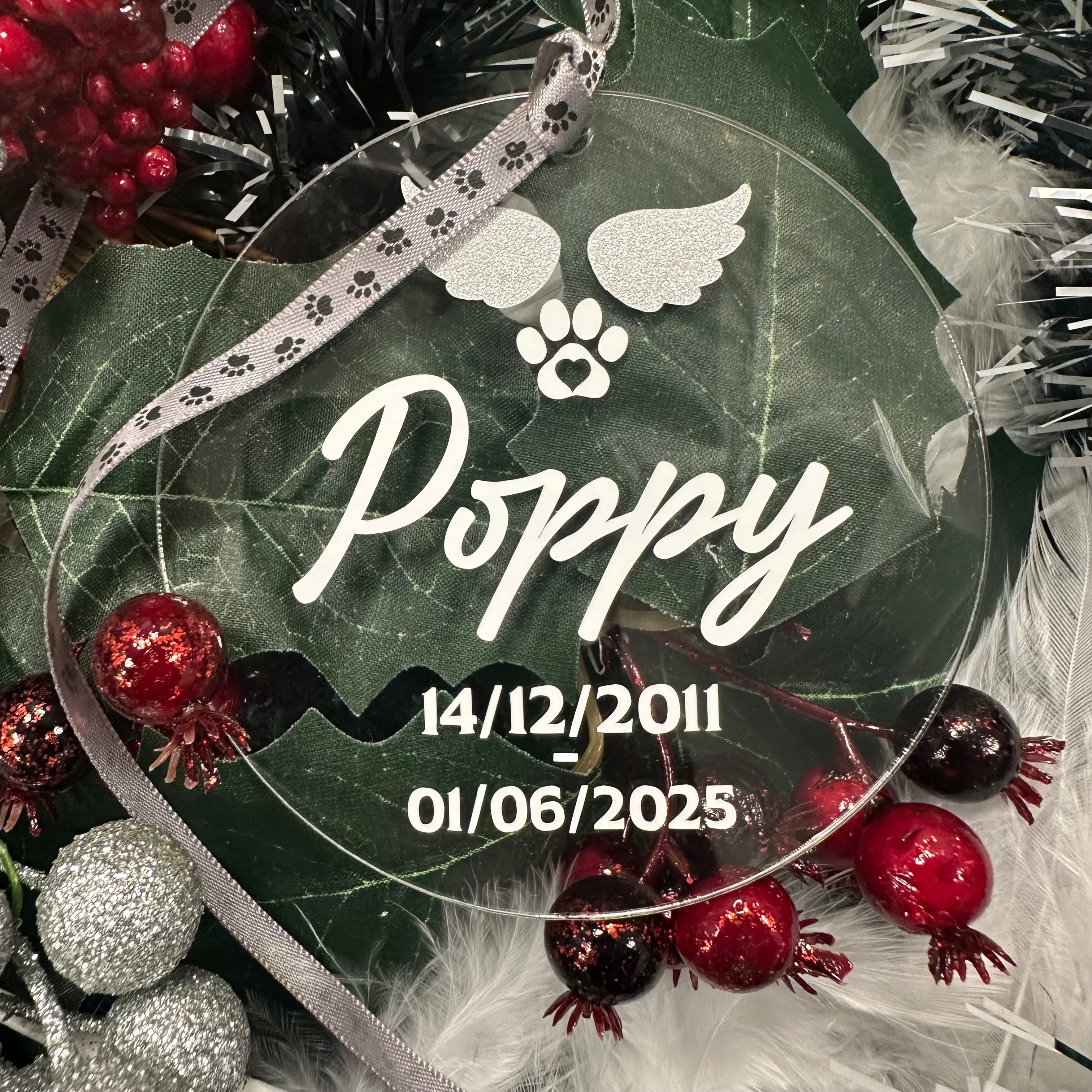 Our Memorial Christmas Baubles are the perfect way to remember your pet this Christmas. We will personalise your dog or cat's name onto one of our flat baubles along with their birth and passing dates. There's angel wings at the top and a paw print with a heart inside. Each bauble is 8cm round and is finished with silver paw print ribbon.