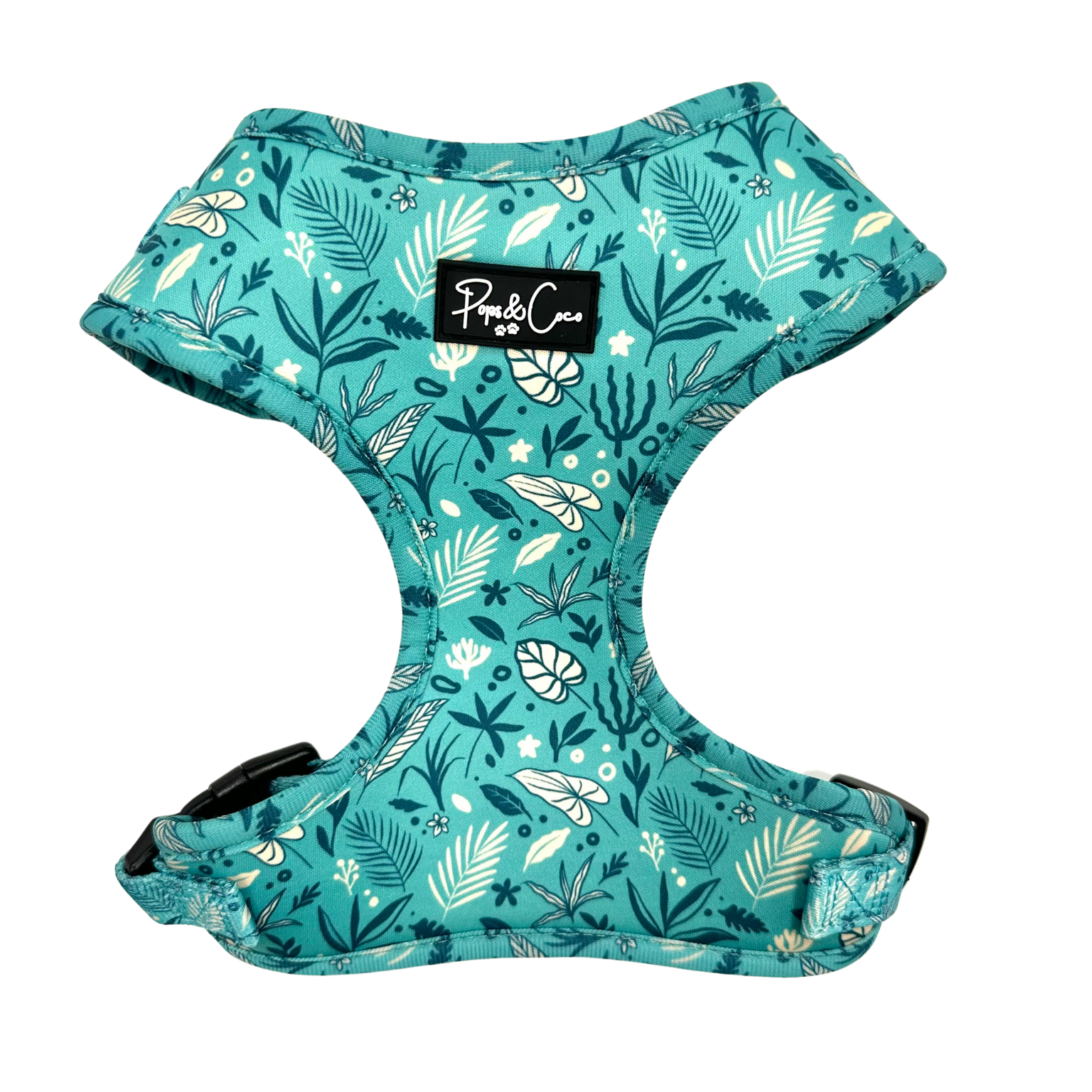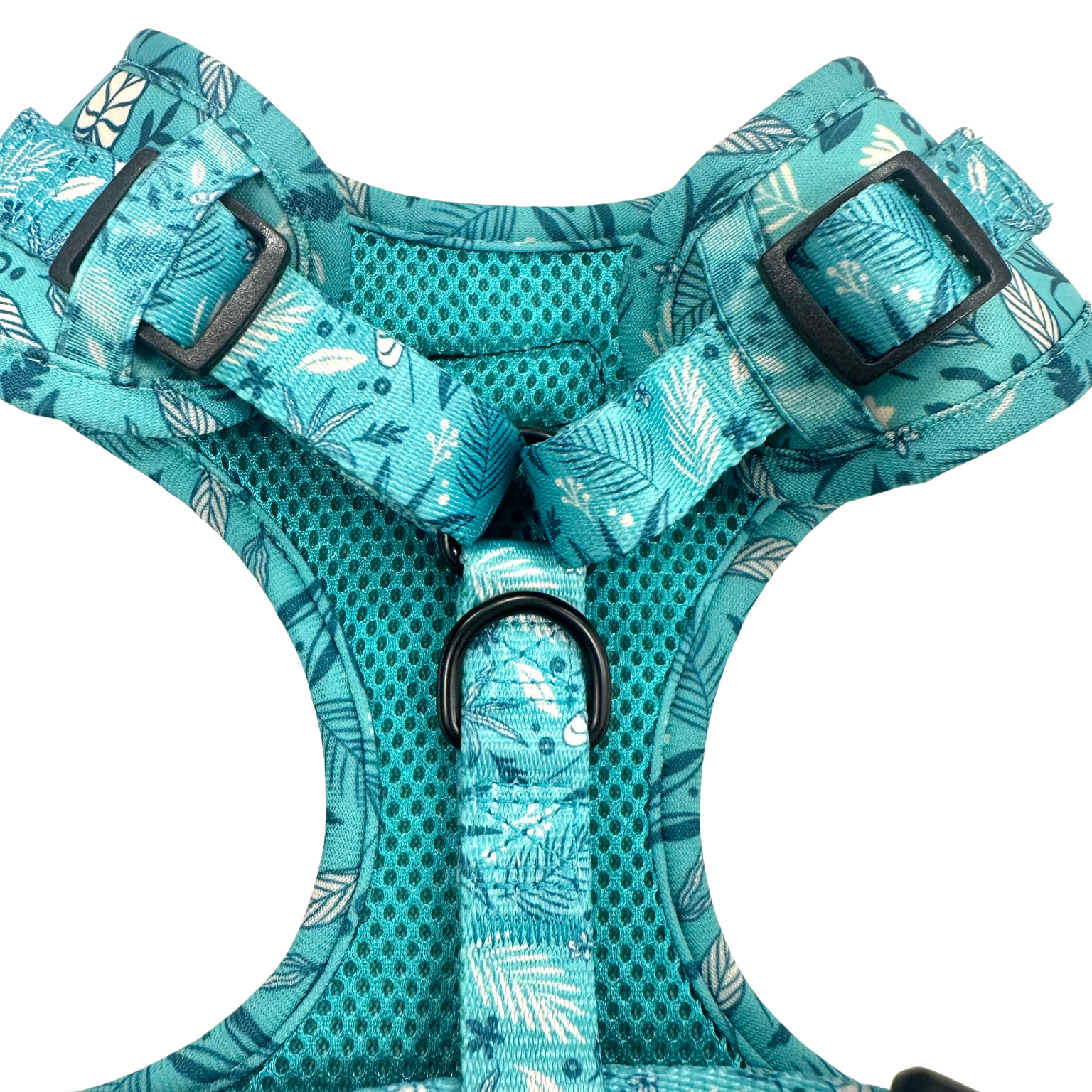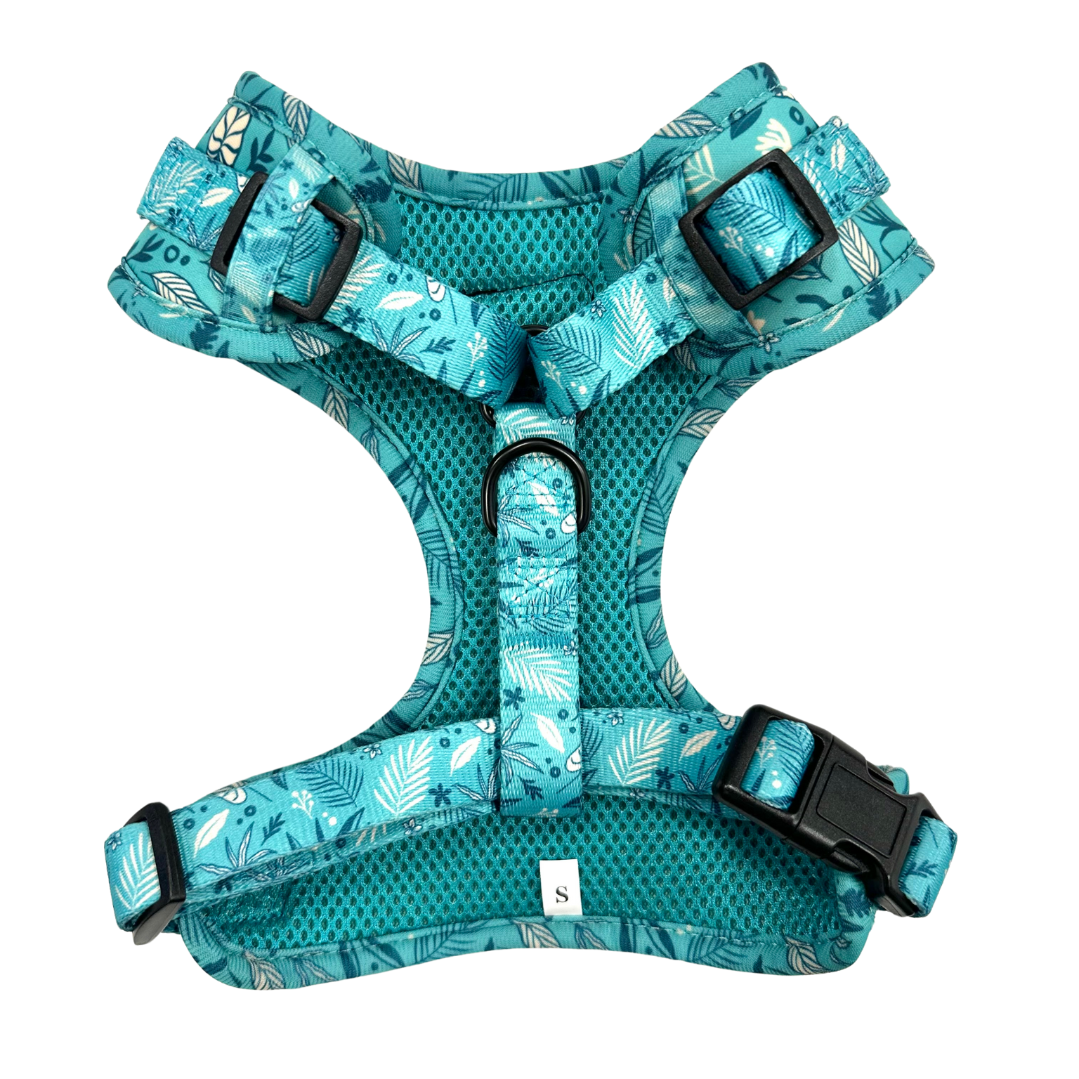 Rainforest is one of our fully adjustable harnesses - meaning you can adjust the neck and the chest. It has pattern matched straps too - the perfect choice for a fashionable pooch! It has a d-ring attachment for your lead and ID tags and a secure buckle.