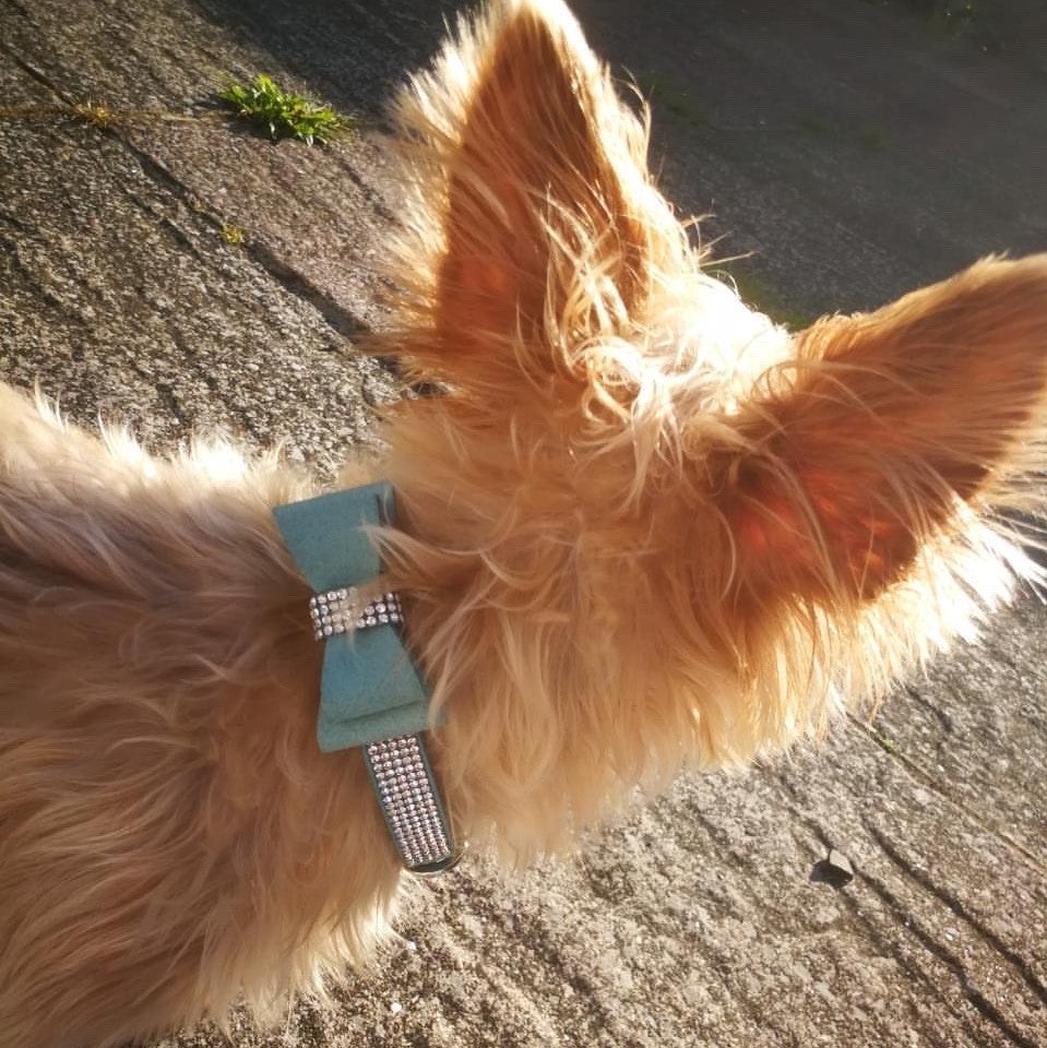 This is a beautiful soft touch sparkly dog collar with a super cute decorative bow with gemstones. Only available in Large, XL and 2XL sizes as follows: