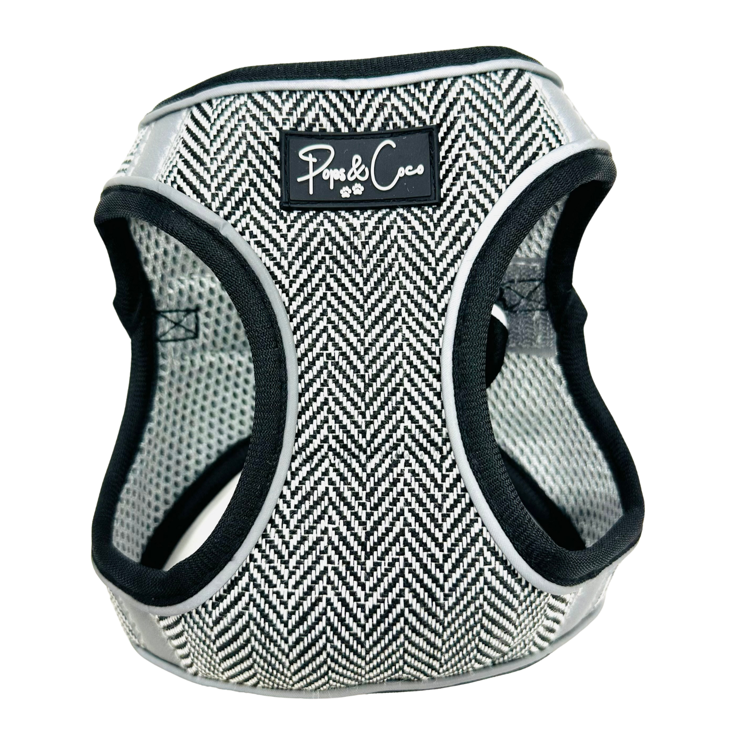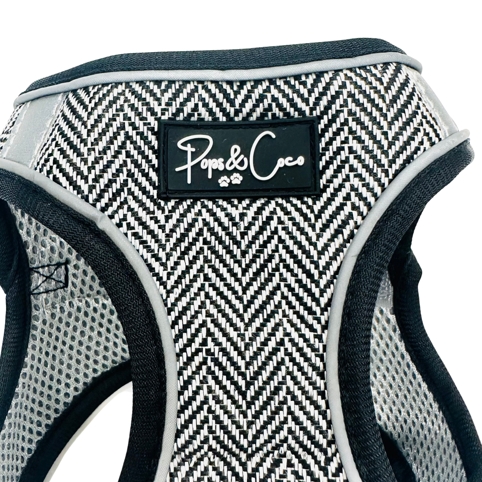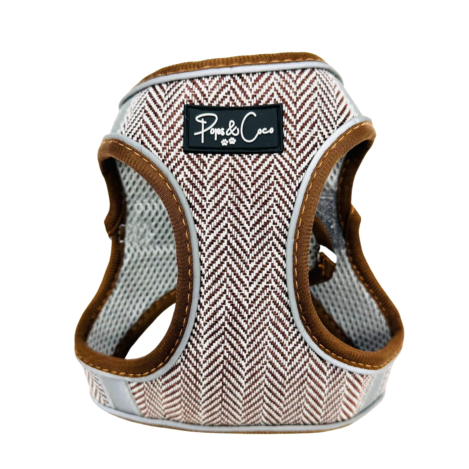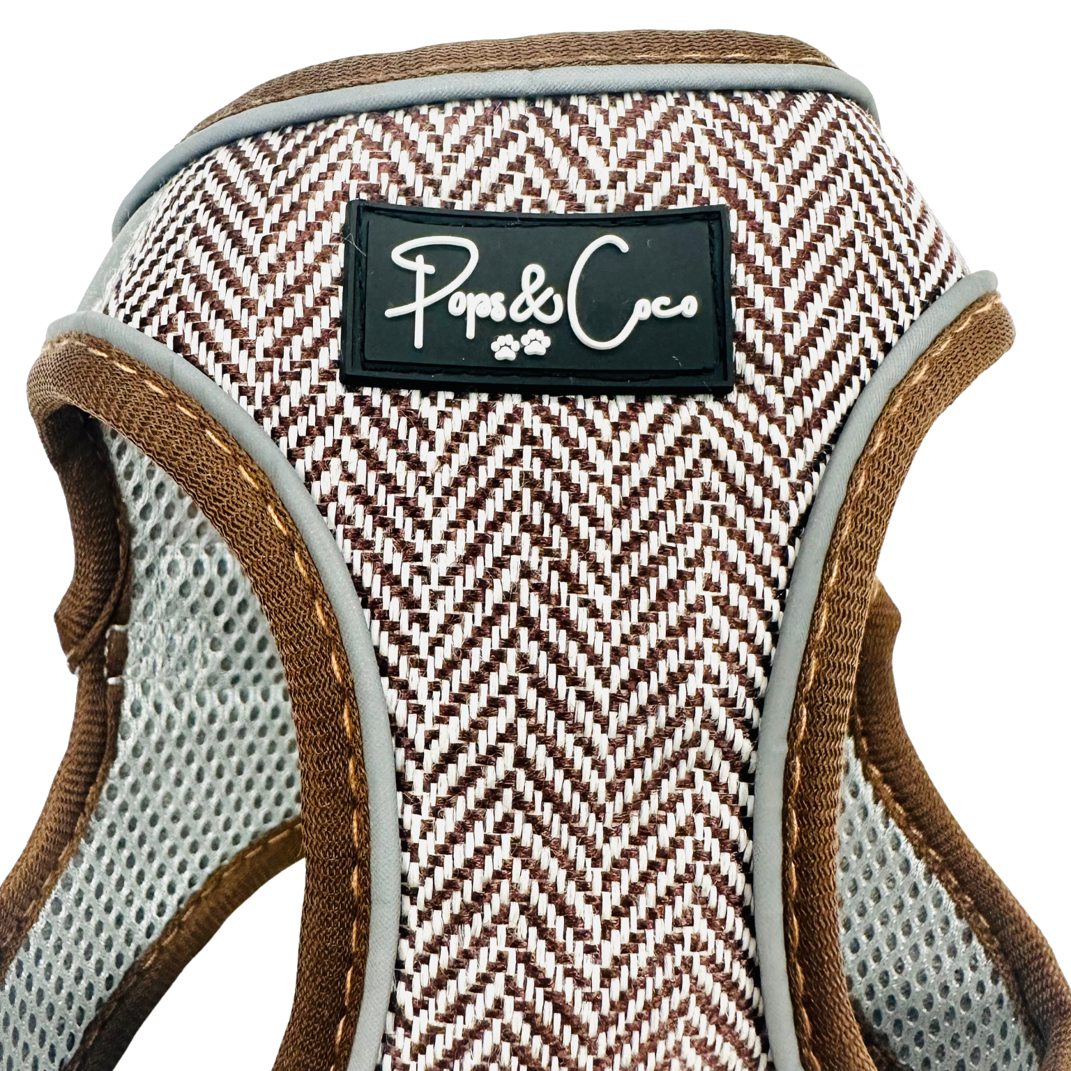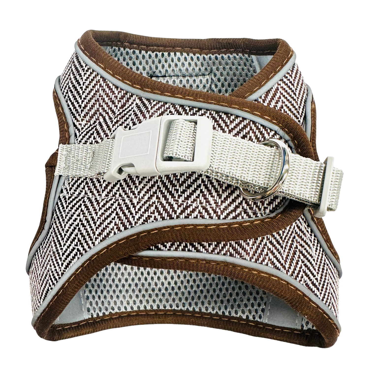 Our Tweed -Style step-in harnesses are ideal for puppies and smaller dogs. You can open this harness out fully, meaning there's no struggling to get this over your pup's head. Simply 'step' them in, velcro the back together and then use the clip buckle for extra security. It has a d-ring attachment for your lead and ID tags too of course!